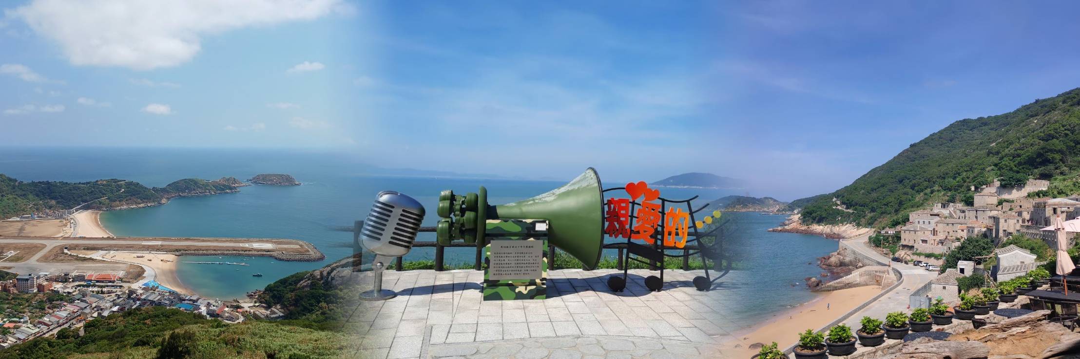 【馬祖播音站】制高點觀景台,是去年為配合硬地超級馬拉松賽事所規劃的在地文化裝置,讓遊客感受兩岸對峙時期的戰地氛圍。當年設於北竿的芹山播音站擁有東南亞功率最大播音設備,每天放送鄧麗君歌曲與心戰喊話,起始句一貫是:「親愛的大陸同胞們….」,如今以幽默的手法,將國共心戰喊話情境轉變成浪漫告白景點、馬祖IG打卡熱點。