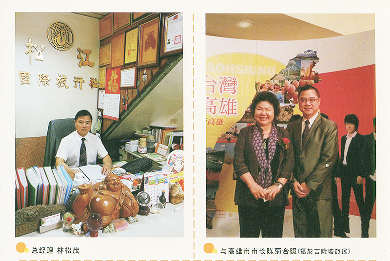 公司成立於1997年6月,以“ 誠信為本,真情相待“原則,提供全方位旅遊服務!依需要安排華語、英語導遊,接待國內外旅客貴!2008年起積极參與海外國際旅展,拓展台灣觀光行銷,樹立高品質服務品牌承接各型蒞台獎勵旅遊、系列團、散拼團、自由行;台灣觀光局登記由種旅行社第5707號;旅行業品質保障協會高第0241號會員,松江旅遊是值得您信賴與旅遊托付的好夥伴!!松江國際旅行社台北、台中各有聯絡處,總公司設立於台灣第二大城高雄市,這是一座同時擁有山、海、河、港的海洋都市,具備了極豐富的人文與自然資源,知名電影及偶像刻常以高雄取景拍攝,旅行台灣,莫忘首選高雄。我們以〝充分的準備、真情的接待〞迎接您的蒞臨。
